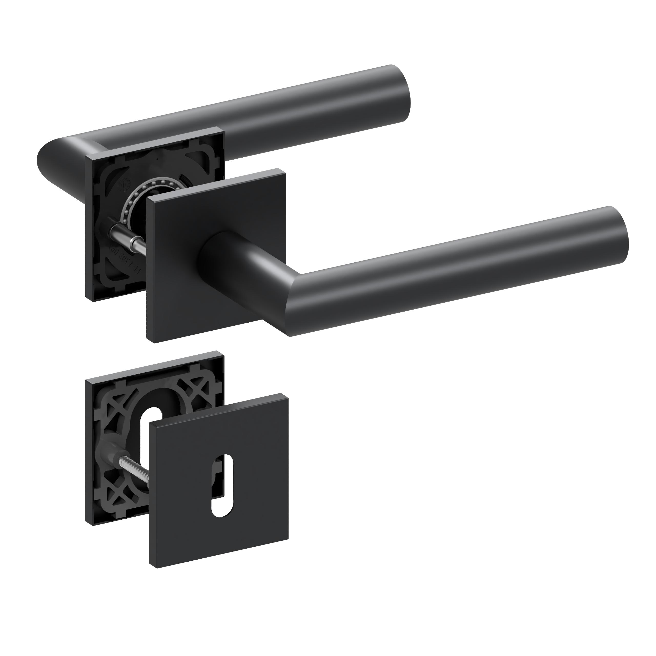 The perfect combination of style and functionality for your door! With our innovativeplain bearing technology slidebloc® made of glass fiber-reinforced polyamide or the maintenance-free ball bearing technology pullbloc® made of hardened steel, we offer you the highest quality. Our rose set is certified in accordance with DIN EN 1906, which gives you additional security. The surface in black satin gives your door a sophisticated style, while the narrow 5 mm rosettes ensure a modern appearance.