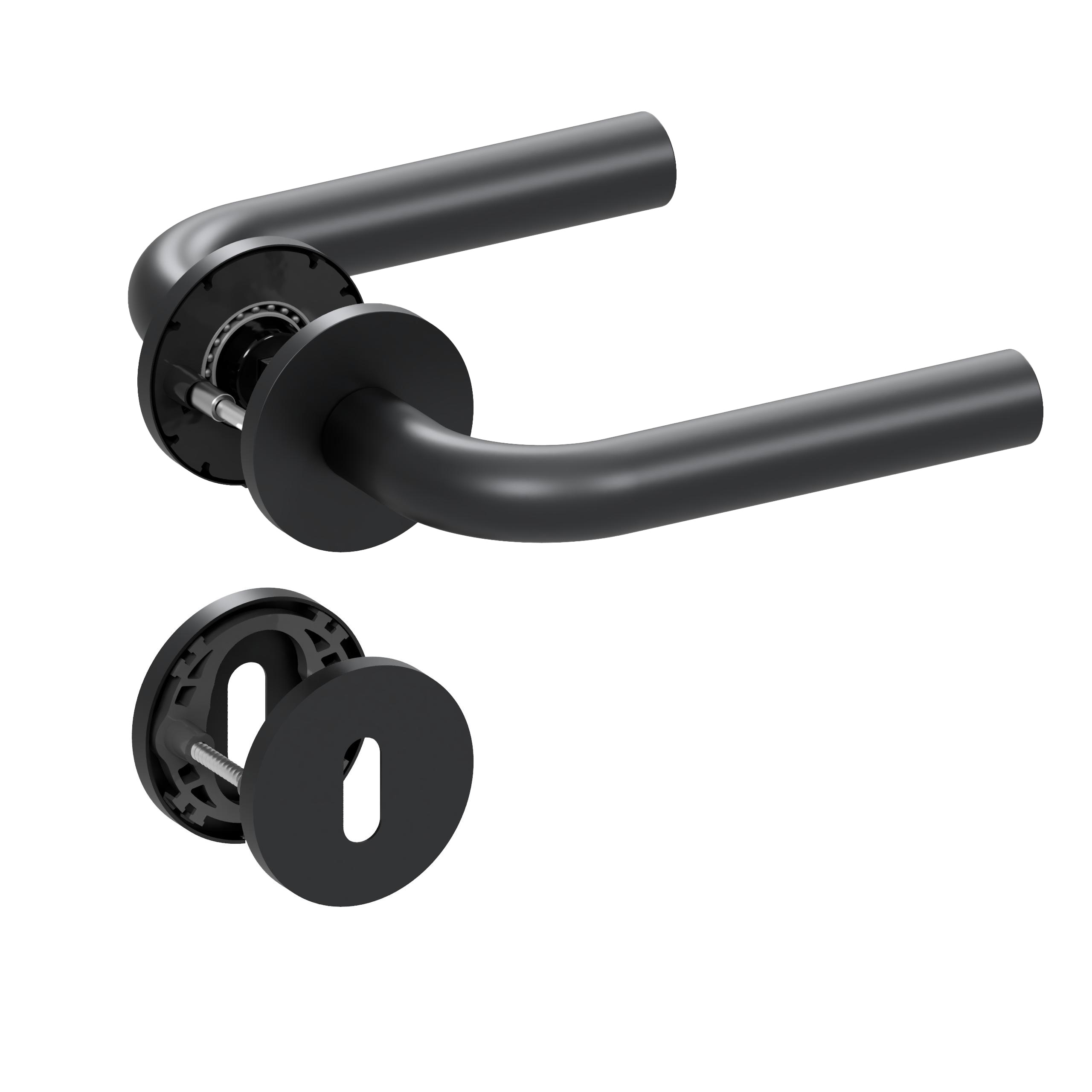¡La combinación perfecta de estilo y funcionalidad para tu puerta! Con nuestra innovadora tecnología de cojinetes deslizantes slidebloc® de poliamida reforzada con fibra de vidrio o la tecnología de cojinetes de bolas pullbloc® de acero endurecido, que no requiere mantenimiento, te ofrecemos la máxima calidad. Nuestro juego de rosetas está certificado según la norma DIN EN 1906, lo que te proporciona una seguridad adicional. La superficie en negro satinado le da a tu puerta un estilo elegante, mientras que las rosetas estrechas de 5 mm le dan un aspecto moderno.